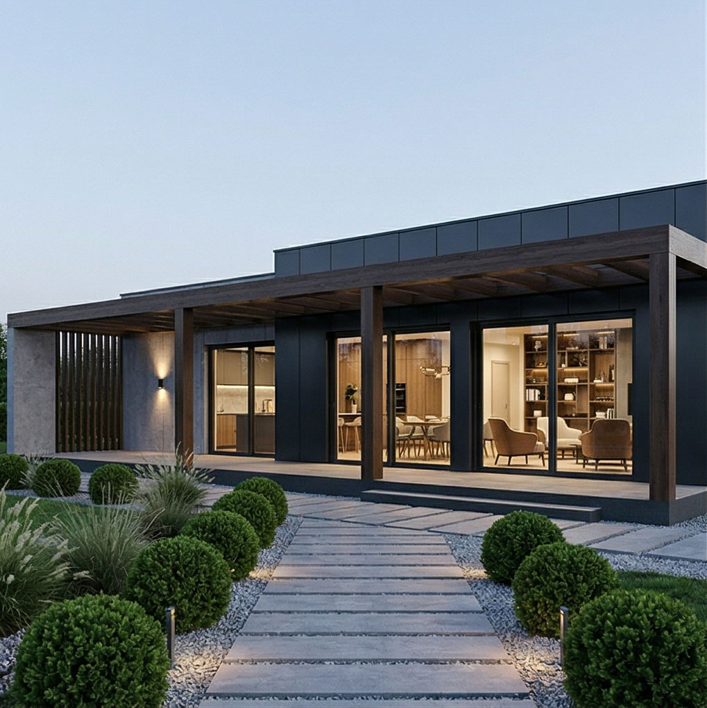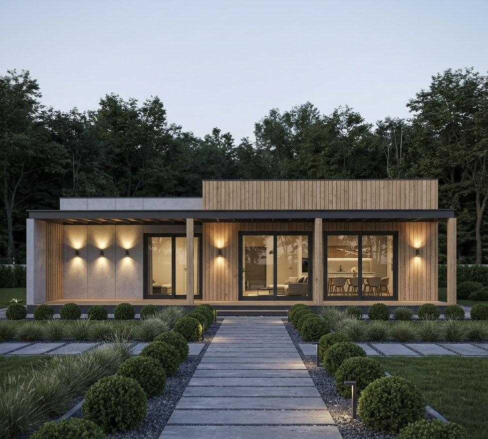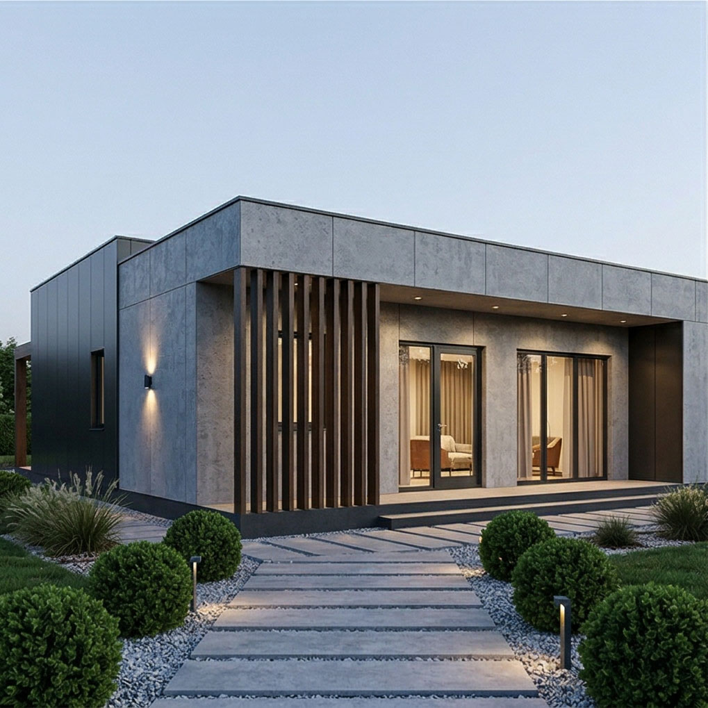 Reprezentatívny prízemný bungalov s fasádou v betónovom dekore s dreveným obkladom