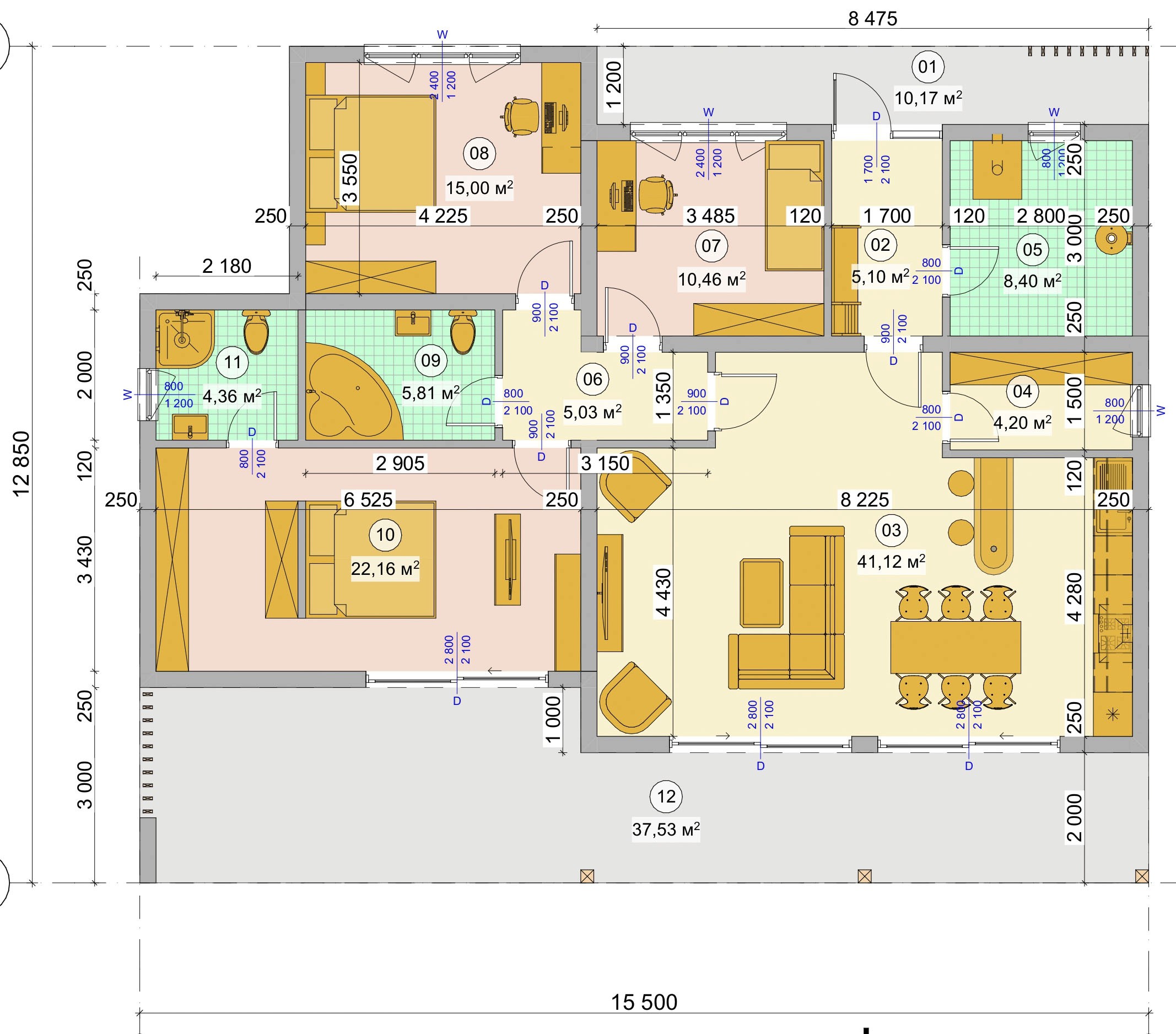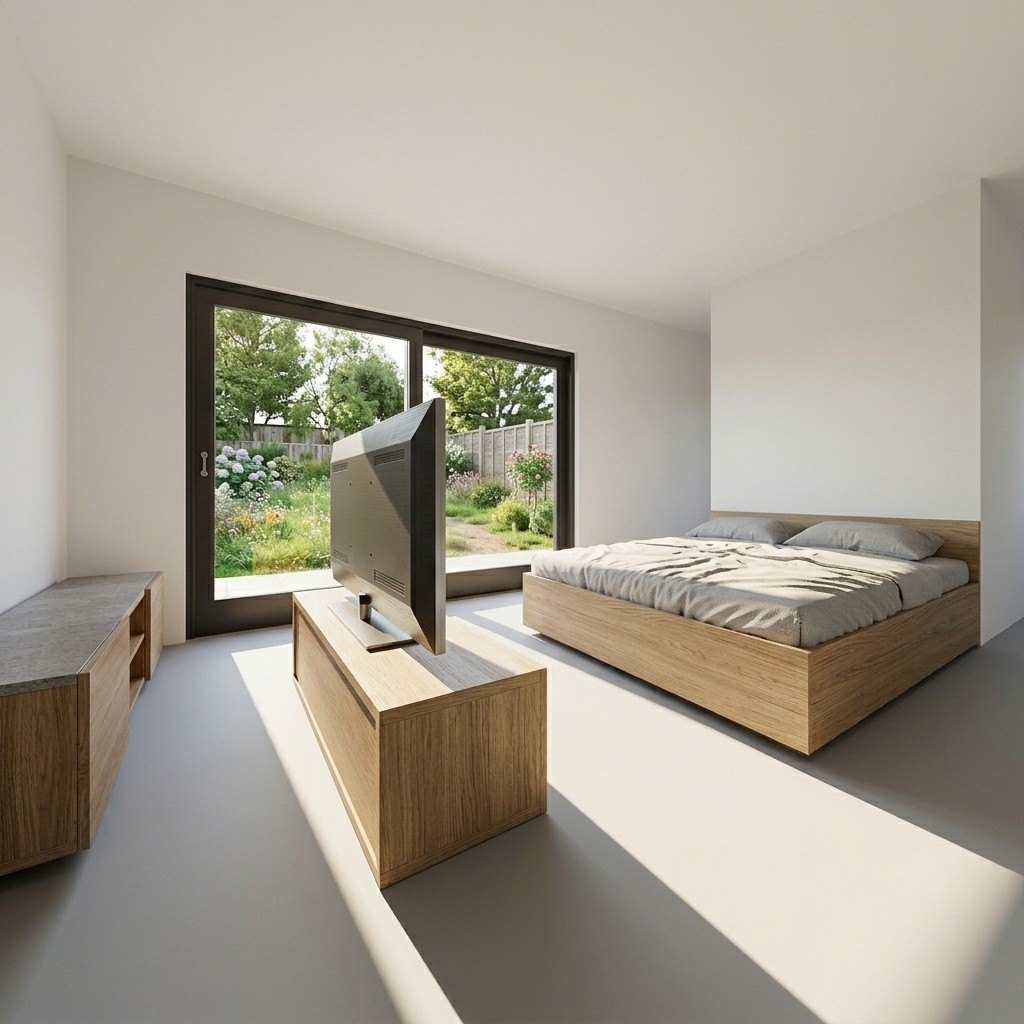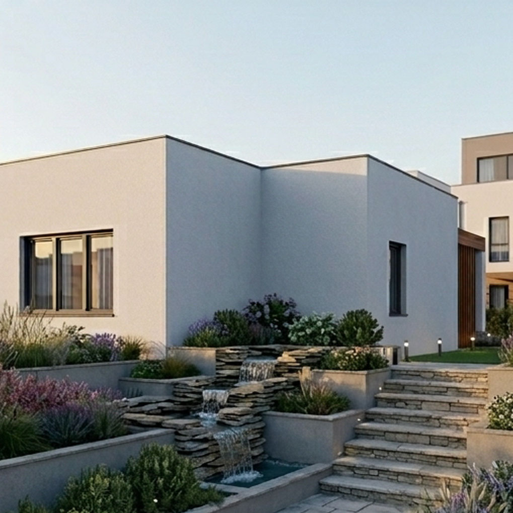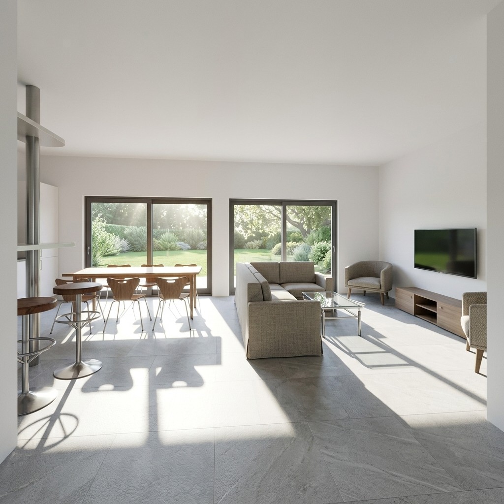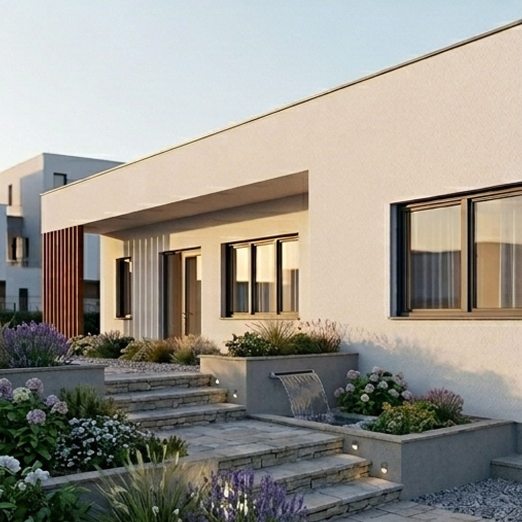 Prízemný dom s plochou strechou kombinuje fasádu v betónovom dekore s dreveným zvislým obkladom. Krytá terasa s rozsiahlymi posuvnými oknami prepája exteriér s interiérom. Dispozícia zahŕňa otvorenú obývačku s kuchyňou a jedálňou, tri spálne a dve kúpeľne.