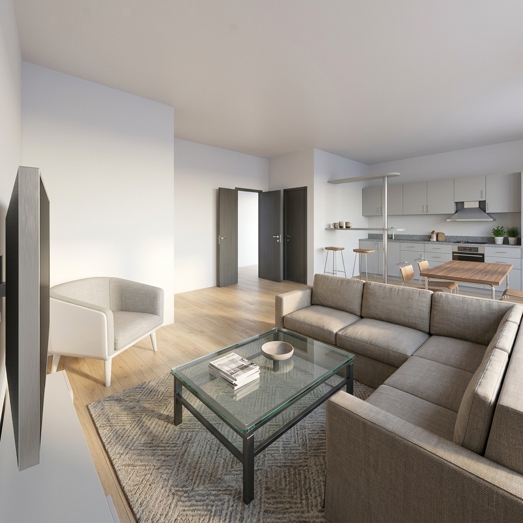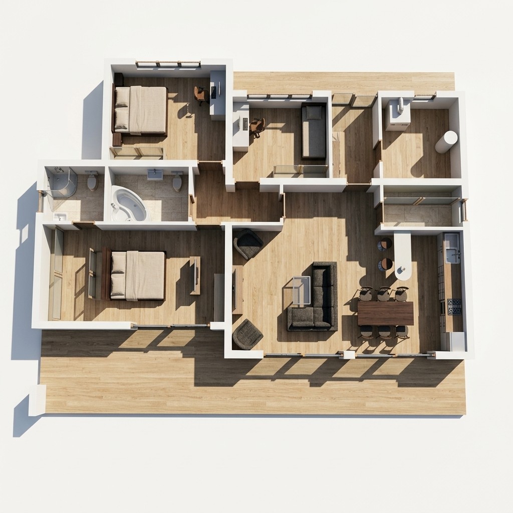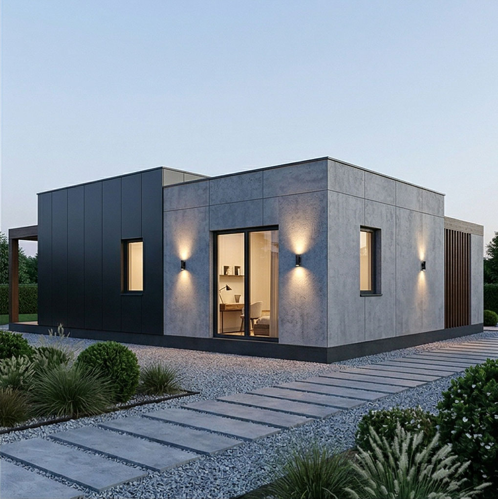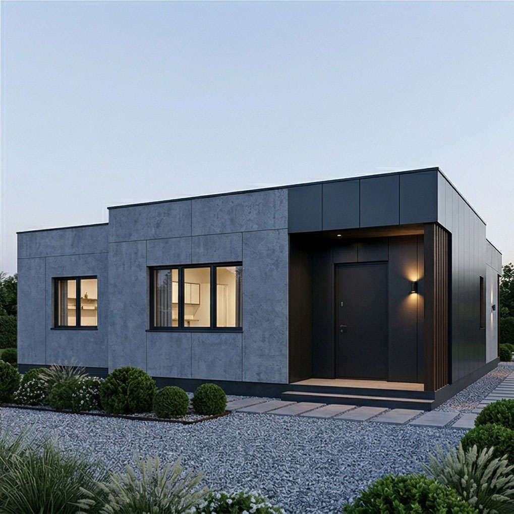 Prízemný bungalov s plochou strechou pôsobí architektonicky výrazne vďaka kombinácii fasádnych panelov v betónovom dekore a zvislého dreveného obkladu. Vstupná časť je zapustená do fasády a tvorí krytý vchod. Krytú terasu je možné doplniť drevenými stĺpmi. Bungalov taktiež disponuje rozsiahlymi posuvnými oknami po celej šírke, ktoré maximálne presvetľujú interiér a prirodzene prepájajú obytný priestor s exteriérom. Dispozícia je členená na otvorený spoločenský priestor, kde obývacia izba plynulo nadväzuje na jedáleň a kuchynský blok. Hlavná spálňa disponuje vlastnou kúpeľňou s rohovou vaňou a sprchovacím kútom. Ďalšie dve spálne zdieľajú samostatnú kúpeľňu. Súčasťou dispozície je aj priestranná chodba.