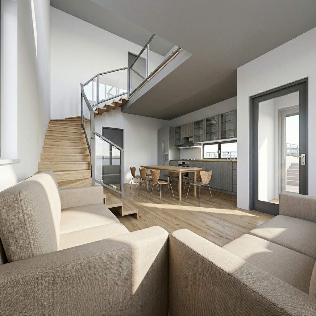Architektúra domčeka dáva dôraz na kompaktnosť a efektívne využitie zastavanej plochy. Okná sú navrhnuté v rôznych veľkostiach, pričom niektoré sú úzko vertikálne a iné širšie, čím vytvárajú dynamický, no stále vyvážený vzhľad. Súčasťou prízemia je integrovaná garáž s priamym napojením na vstupnú časť domu. Dispozícia je organizovaná okolo centrálneho schodiska ako hlavného komunikačného jadra. Prízemie tvorí otvorený obytný priestor s napojením na kuchyňu a jedáleň, doplnený o hygienické zázemie. Súčasťou je aj integrovaná garáž s priamym vstupom do domu. Horné podlažie predstavuje nočnú zónu s izbami prístupnými z chodby, doplnenú o dve kúpeľne a úložný priestor. Dispozícia je trendy a efektívna.