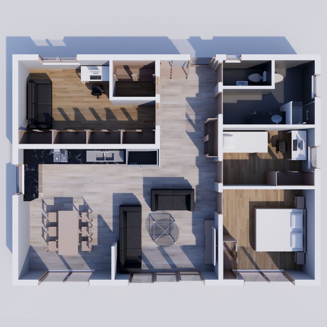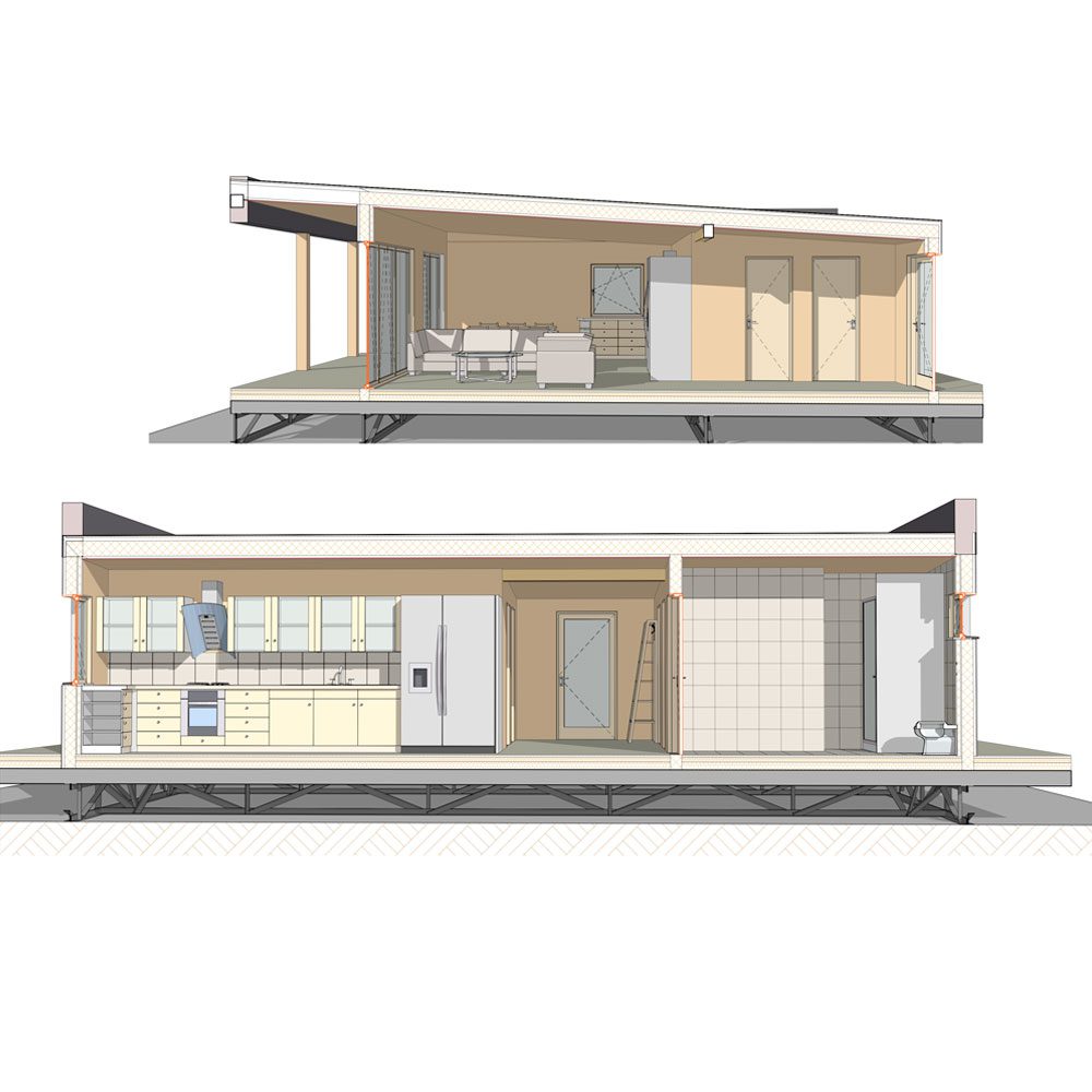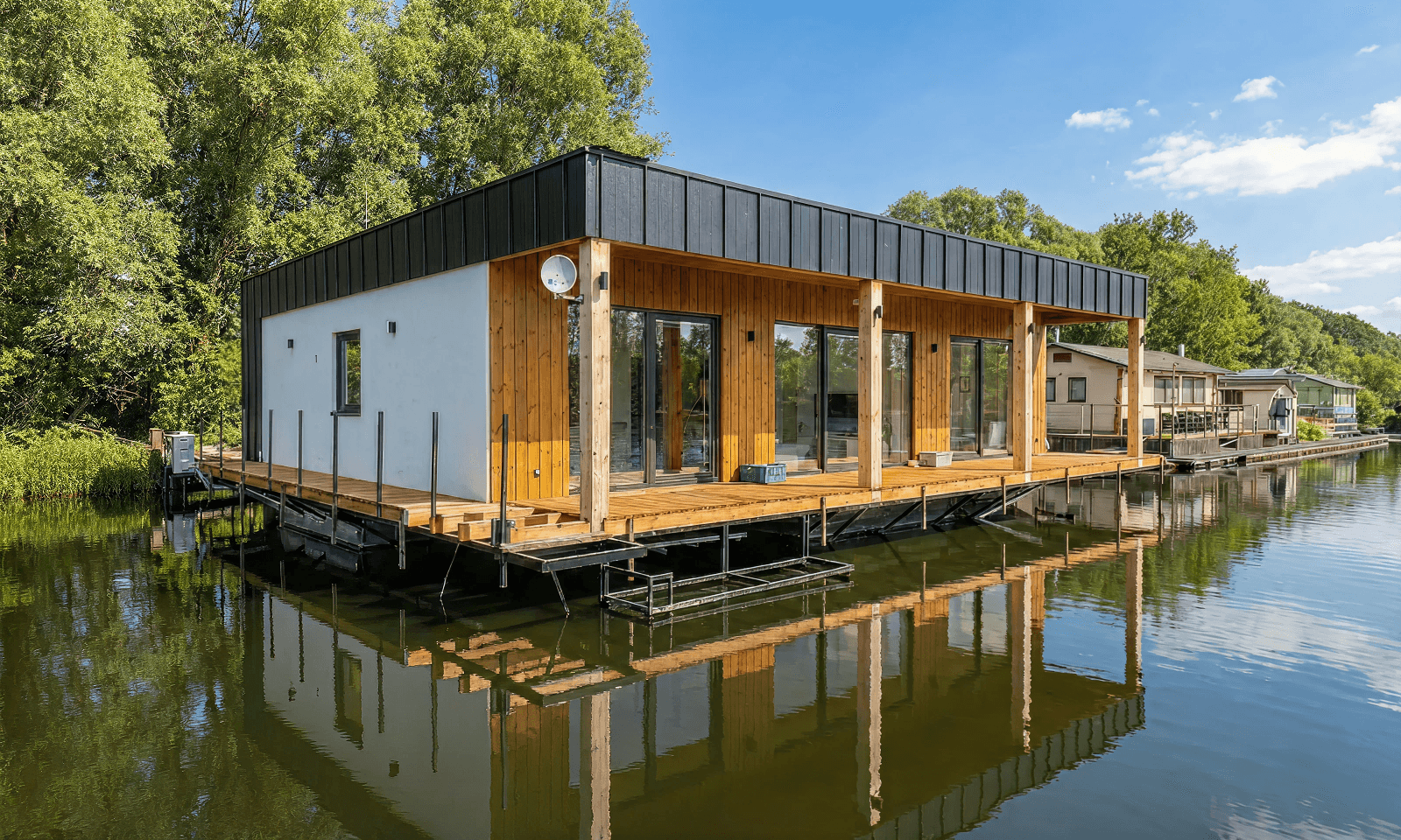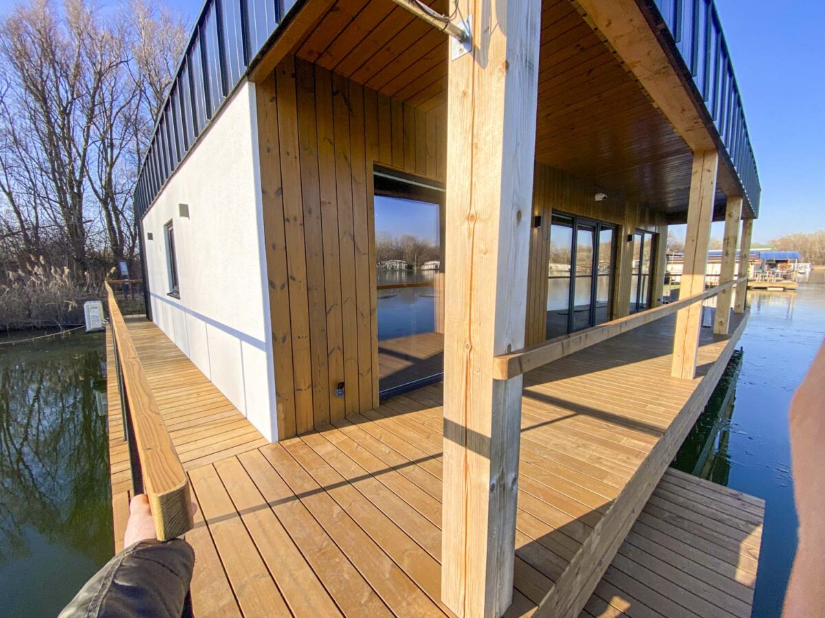 Exteriérová fasáda je tvorená kombináciou bielej omietky, zvislého dreveného obkladu v teplých tónoch a výrazného čierneho lemovania z falcovaného plechu. Objekt je osadený na stabilnej oceľovej konštrukcii s plavákmi, pričom bezpečnosť zabezpečuje minimalistické lanové alebo kovové zábradlie lemujúce ochodzu. Interiér dominuje rozľahlá denná zóna spájajúca obývaciu časť s kuchynským a jedálenským kútom. Nočná časť zahŕňa hlavnú spálňu a dve multifunkčné miestnosti. Súčasťou je moderne riešená kúpeľňa so sprchovacím kútom a samostatná technická zóna. Celý interiér zjednocuje svetlá podlaha a vysoké stropy kopírujúce sklon strechy.