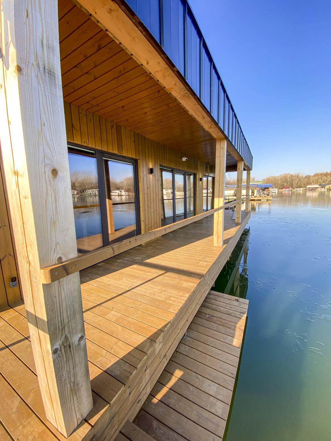 Moderný a priestranný dom navrhnutý pre komfortný život pri vodnej hladine. Architektúra kombinuje industriálne prvky s prírodným drevom, čím vytvára harmonický celok so zaujímavou asymetrickou líniou strechy.