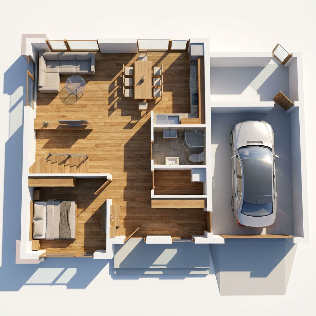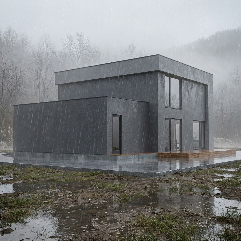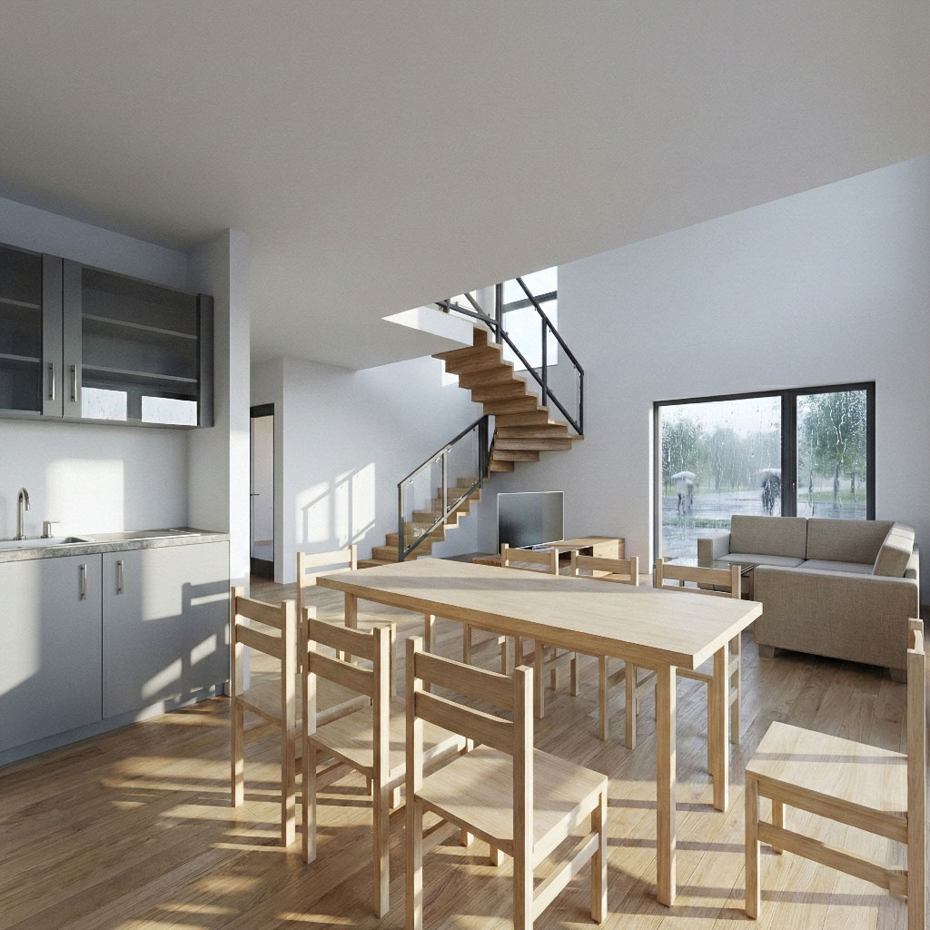 Exteriér domčeka stavia na čistých líniách, jednoduchom tvare a plochej streche, bočná garáž je prirodzene integrovaná do celkovej stavby. Fasáda kombinuje tmavú farbu s elegantným vertikálnym dreveným obkladom, ktorý zvýrazňuje vstupnú časť a okná v prednej časti domu. Okná sú riešené ako veľkoformátové, s tmavými rámami. Dispozícia prízemia je navrhnutá ako otvorená denná zóna so vstupom, hygienickým a technickým zázemím a jednou spálňou. Poschodie tvorí nočná časť s oddelenými izbami a kúpeľňou, čím je zabezpečené funkčné a prehľadné rozdelenie domčeka.