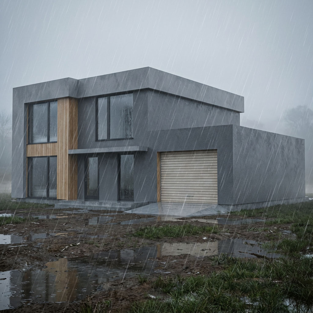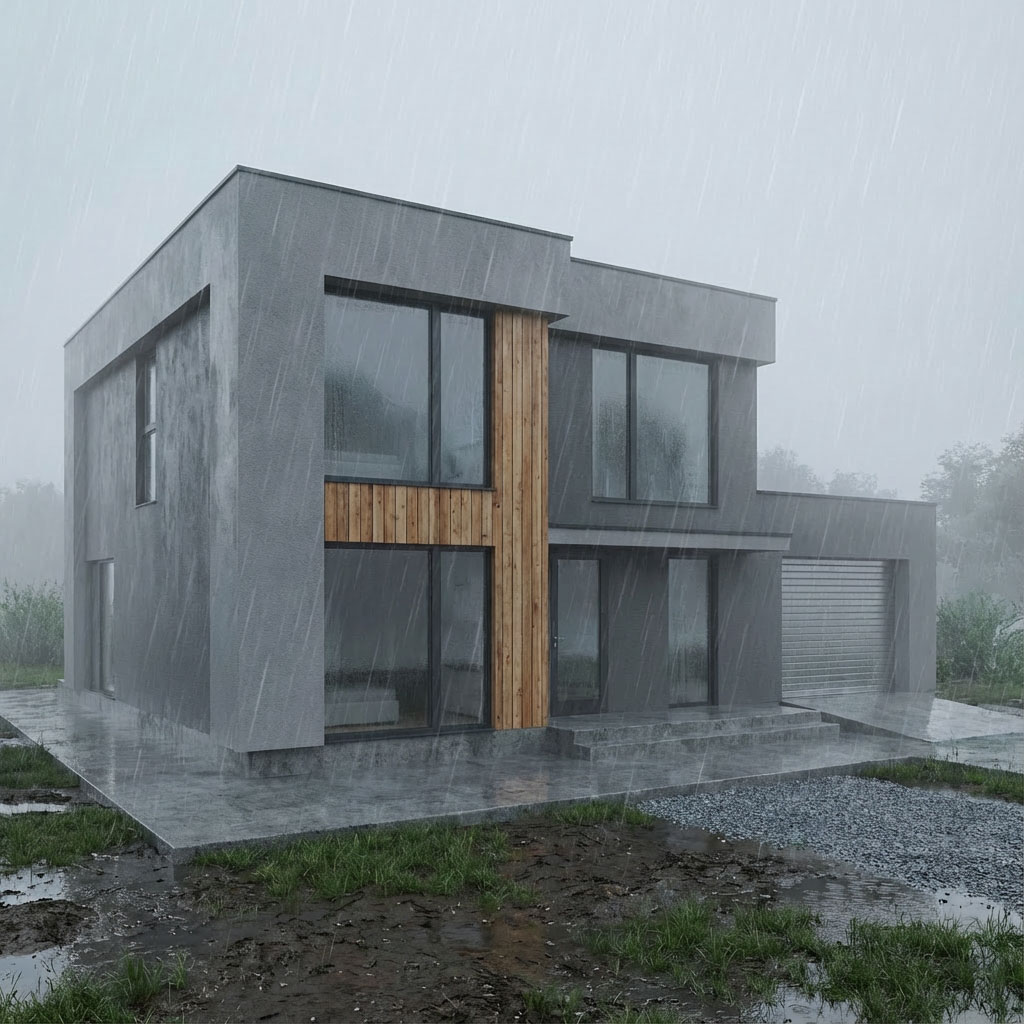 Kompaktný dvojpodlažný domček s plochou strechou a bočnou garážou.