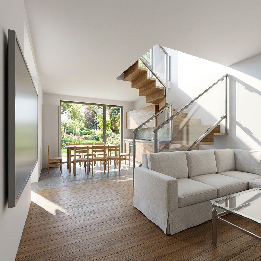 Moderný biely strop (Trámy zakryté sadrokartónom)