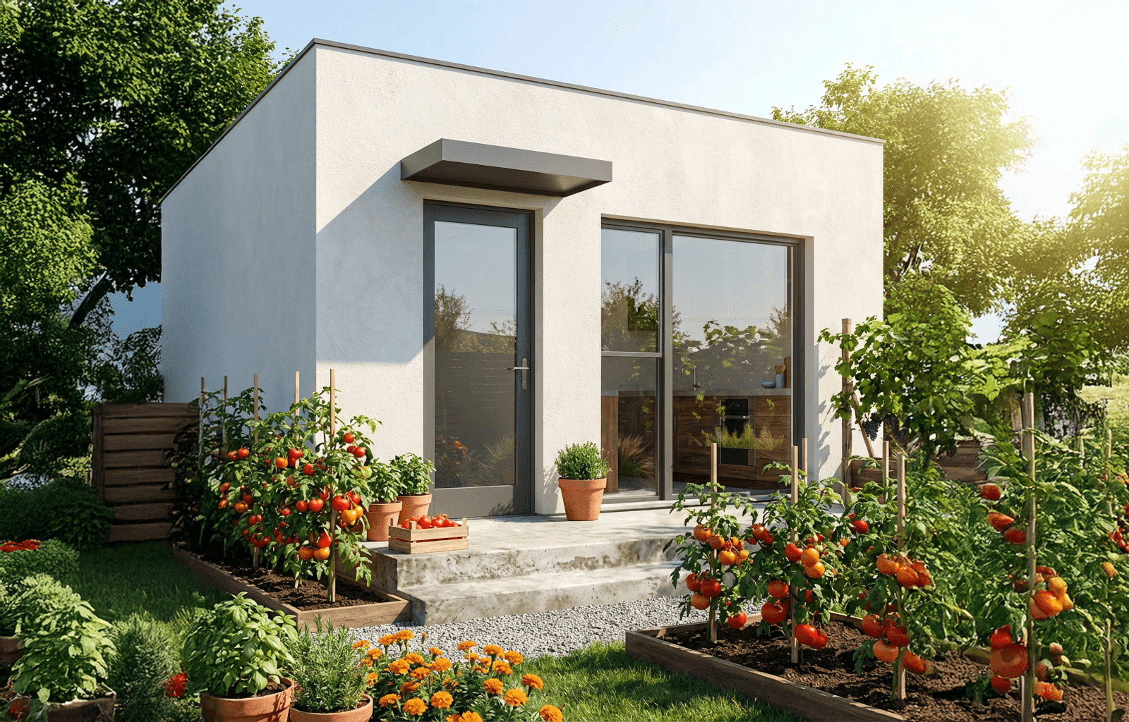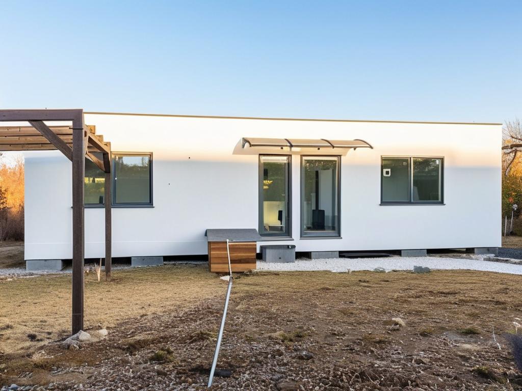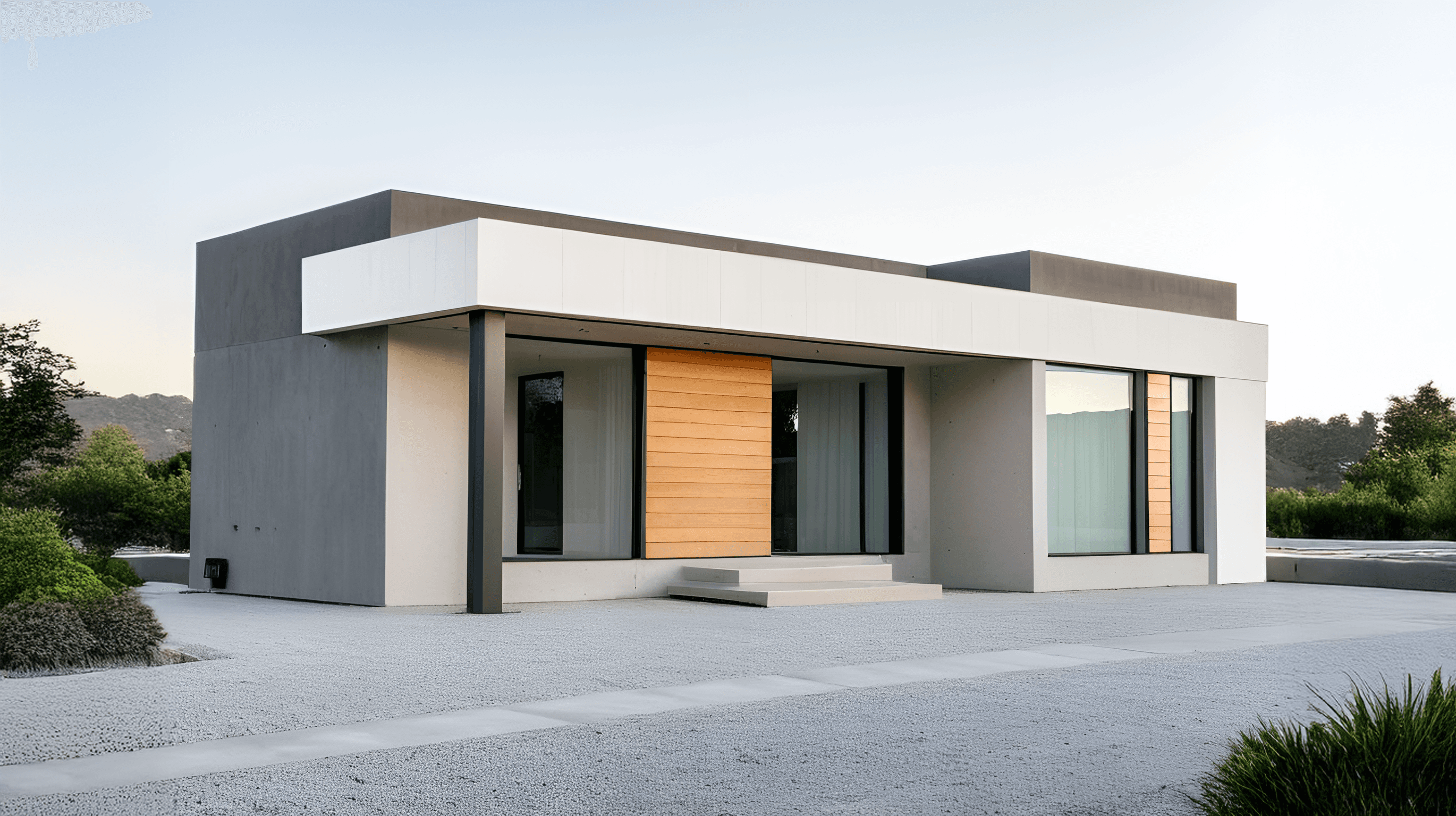 Minimalistický modulárny domček s plochou strechou v sebe spája čistý dizajn a maximálnu funkčnosť. Efektívna dispozícia 3kk ponúka svetlú centrálnu časť s kuchyňou a obývačkou, ktorú dopĺňajú dve samostatné spálne z každej strany pre dokonalé súkromie.