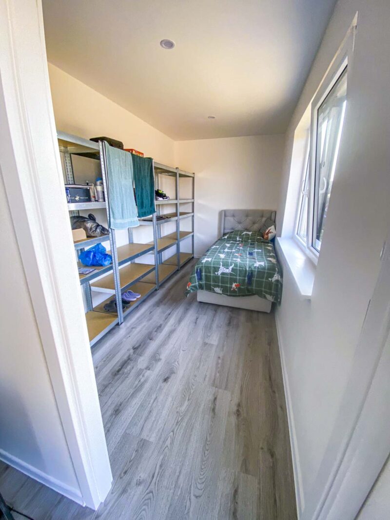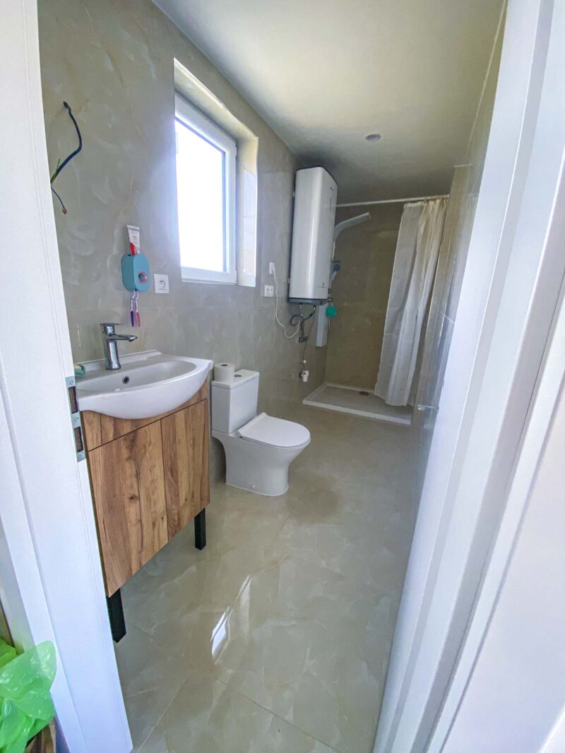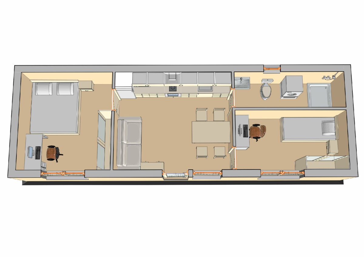 Domček s plochou strechou a minimalistickým dizajnom ponúka efektívne riešené 3-izbové bývanie s centrálnou obývacou časťou a dvomi spálňami. Srdcom domčeka je otvorený priestor spájajúci kuchynskú linku, jedálenský kút a obývačku s výhľadom do exteriéru, zatiaľ čo nočnú zónu tvorí hlavná spálňa s pracovným kútom a samostatná izba na opačnom konci dispozície. Súčasťou vybavenia je priestranná kúpeľňa s miestom pre práčku. Čistá biela fasáda s veľkoformátovými oknami zabezpečuje dostatok prirodzeného svetla v celom interiéri. Vďaka svojmu funkčnému rozvrhnutiu je domček ideálny ako celoročné bývanie.