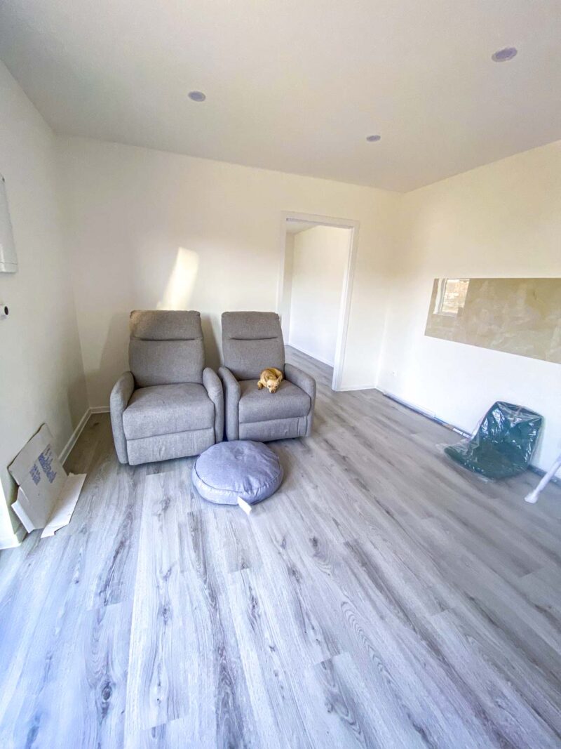 Moderný biely strop (Trámy zakryté sadrokartónom)