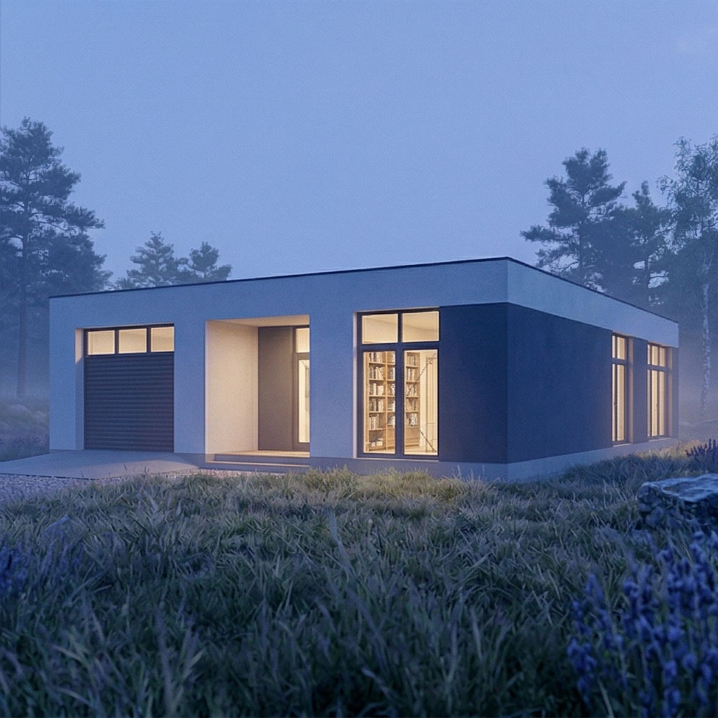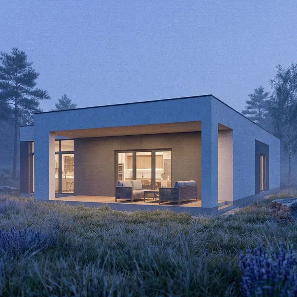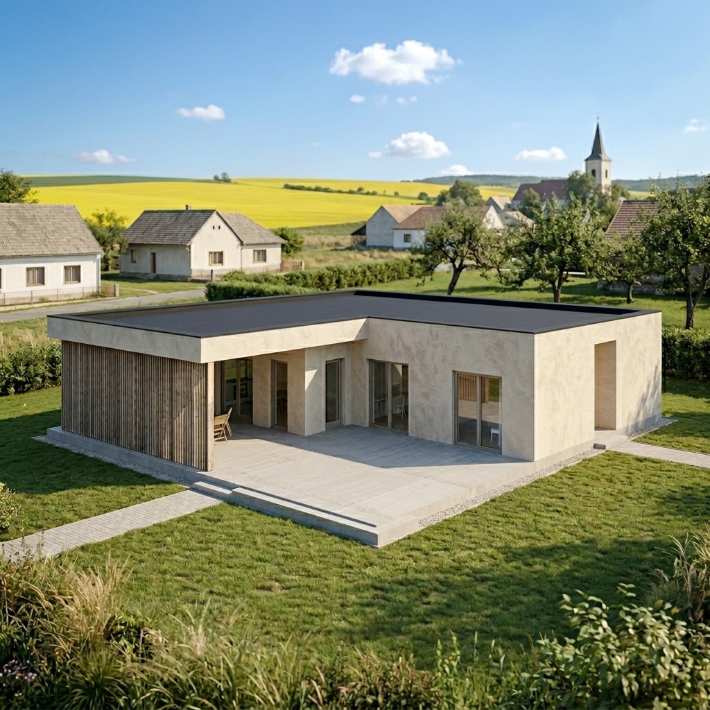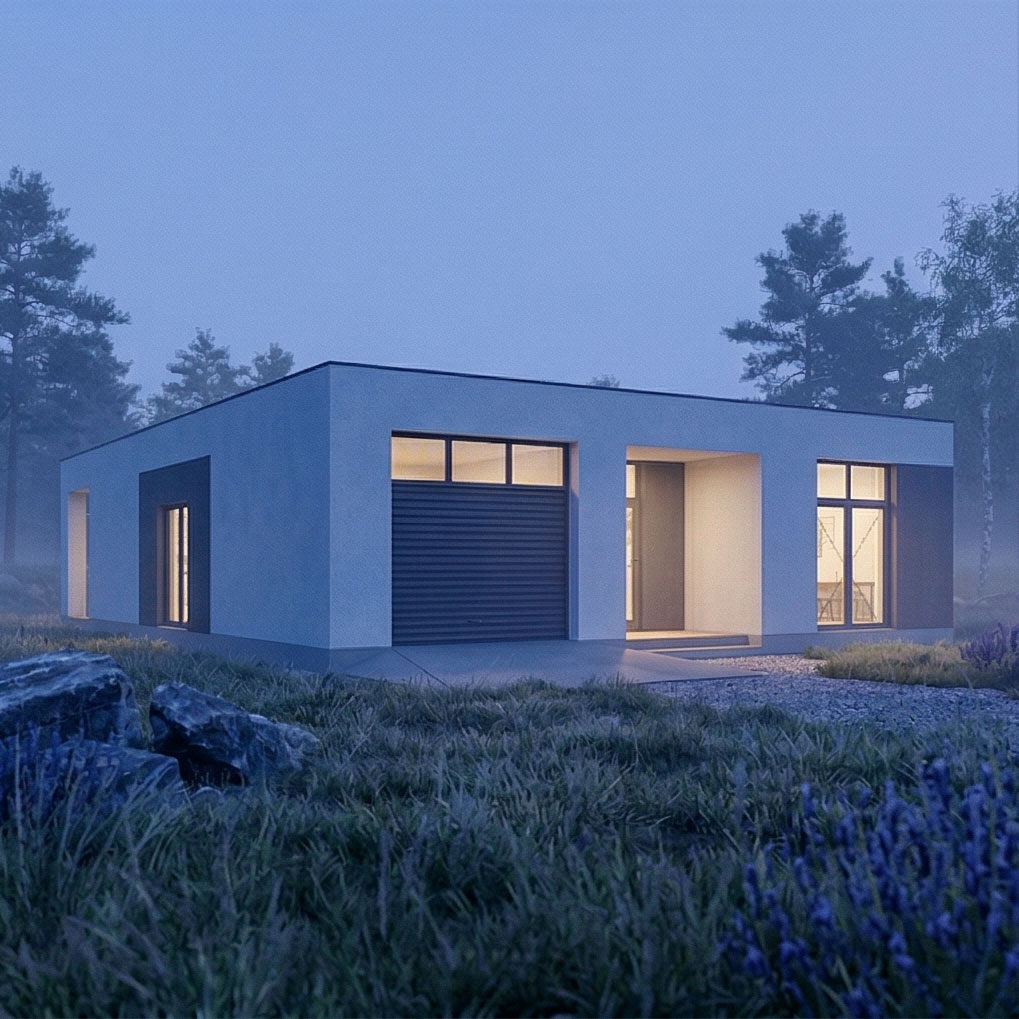 Prízemná stavba s čistými líniami, plochou strechou, krytou terasou a integrovanou garážou ponúka pohodlné bývanie v spojení interiéra a vonkajšieho prostredia. Veľkoformátové presklené okná a rohové zasklenia zabezpečujú dostatok denného svetla. Interiér tvorí otvorený denný priestor s kuchyňou, jedálňou a obývačkou, doplnený o komfortné izby a praktické zázemie.