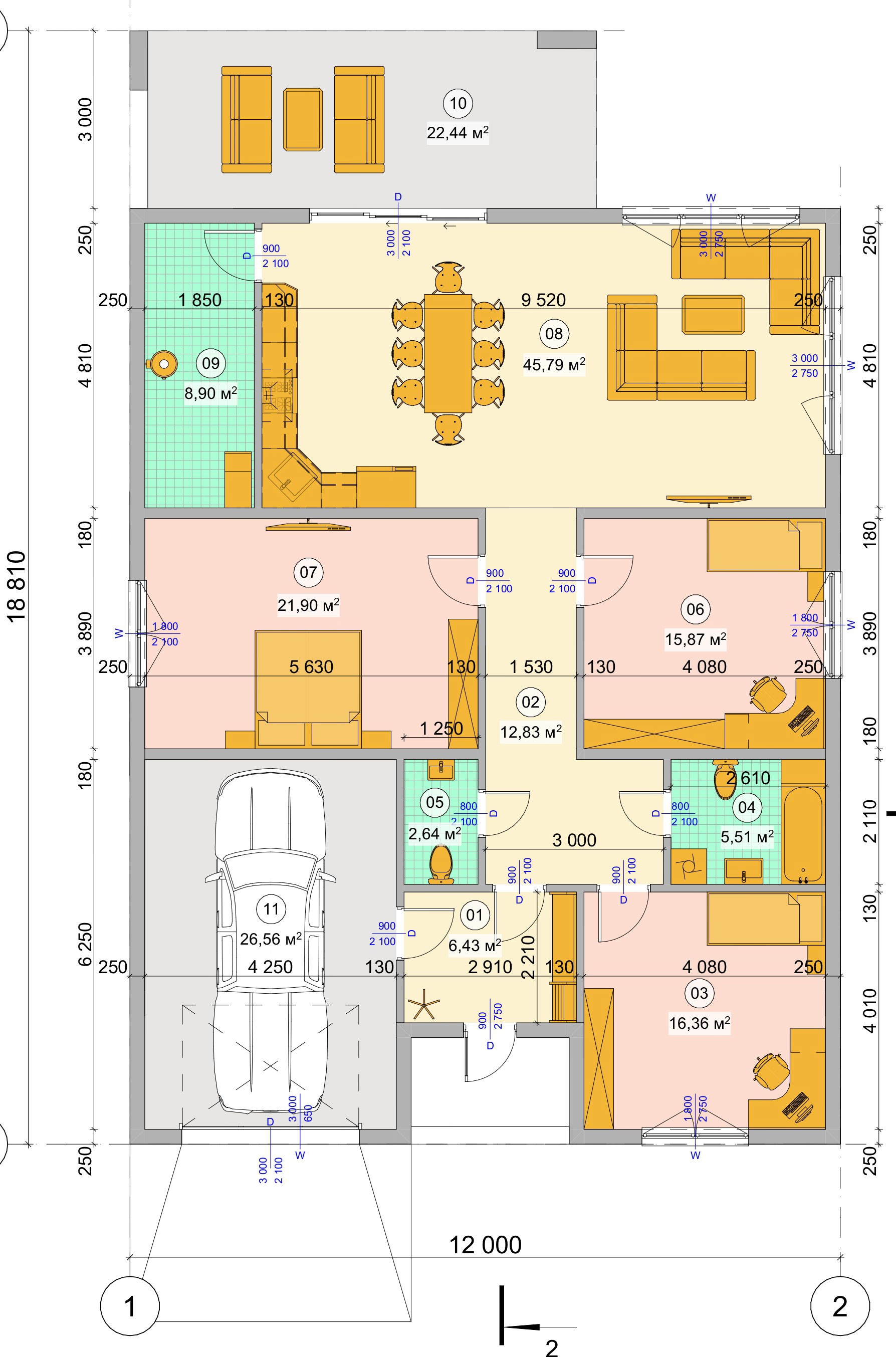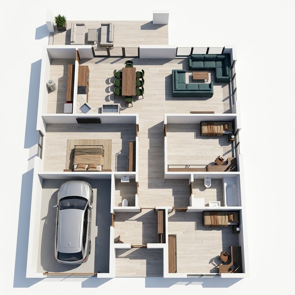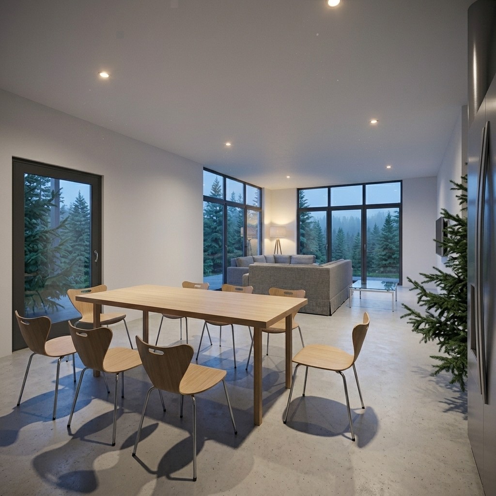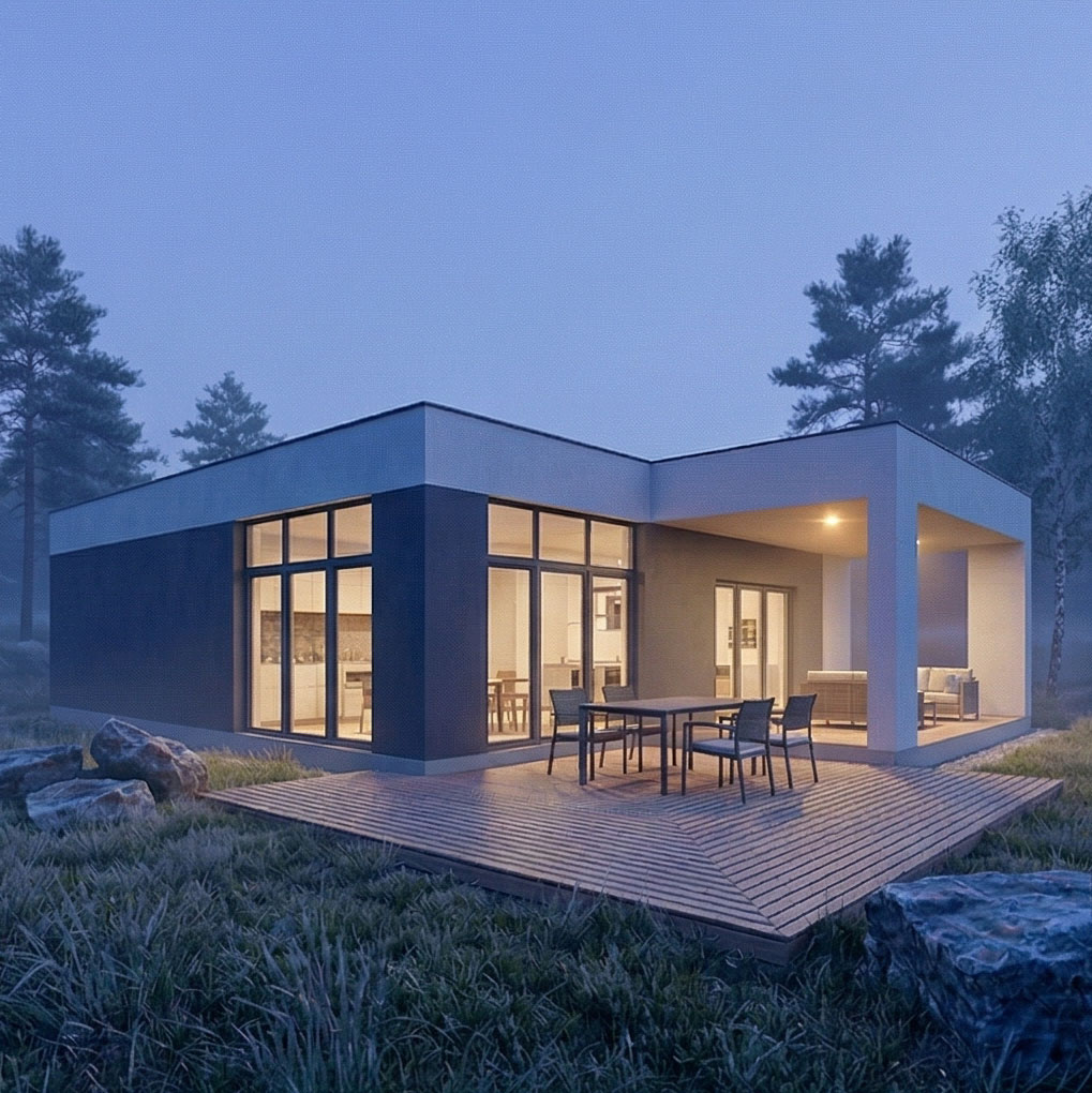 Prízemná stavba s čistými líniami, plochou strechou, krytou terasou a integrovanou garážou ponúka pohodlné bývanie v spojení interiéra a vonkajšieho prostredia. Veľkoformátové presklené okná a rohové zasklenia zabezpečujú dostatok denného svetla. Interiér tvorí otvorený denný priestor s kuchyňou, jedálňou a obývačkou, doplnený o komfortné izby a praktické zázemie.
