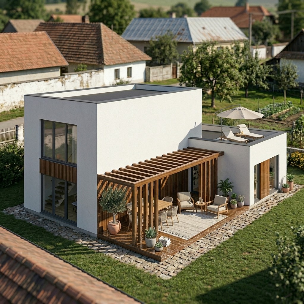 Architektúra domu je založená na jednoduchých kubických tvaroch. Súčasťou objektu je aj krytá garáž, ktorá je citlivo začlenená do celkového objemu stavby. Dominantným prvkom je krytá terasa, poskytujúca priestor na oddych aj stolovanie počas celého roka. Presklené plochy sú navrhnuté s dôrazom na orientáciu a výhľady – veľké posuvné okná smerujú do záhrady, rohové presklenia opticky zväčšujú priestor a menšie okná zabezpečujú prirodzené osvetlenie v súkromných miestnostiach. Dispozícia domu je riešená ako otvorený denný priestor prepojený s exteriérom, pričom nočná časť ponúka dostatok súkromia v spálňach. Interiér je možné zladiť v minimalistickom duchu s dôrazom na funkčnosť a nadčasový dizajn.