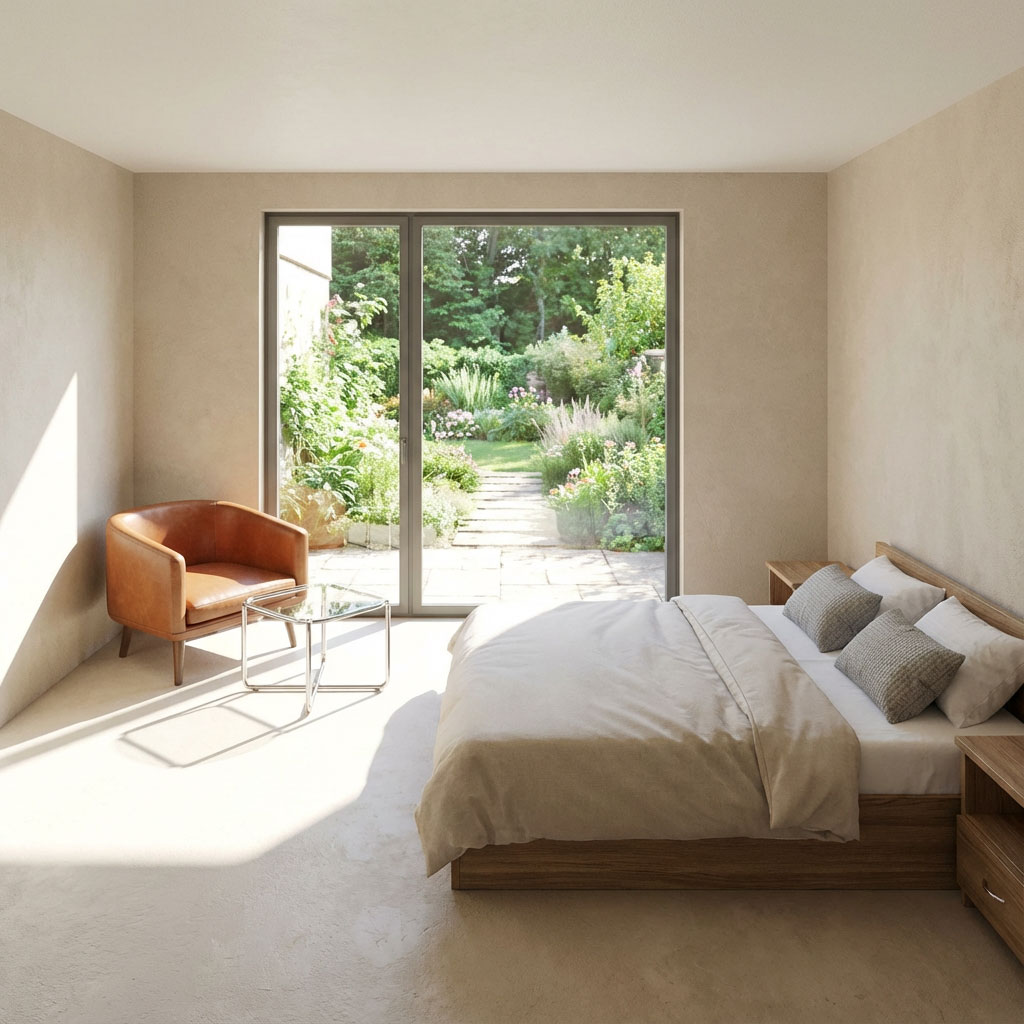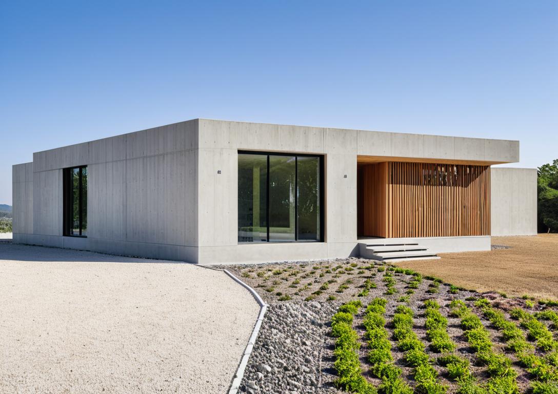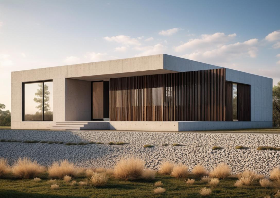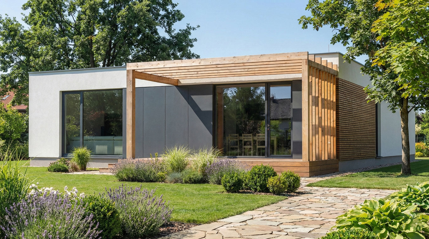 Moderný bungalov s plochou strechou spájajúci hladký svetlý monolit s hrejivým prírodným dekorom.