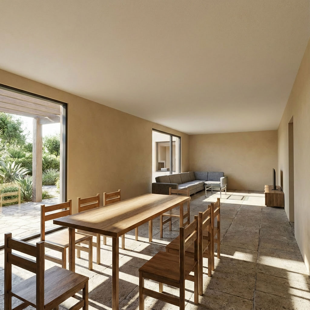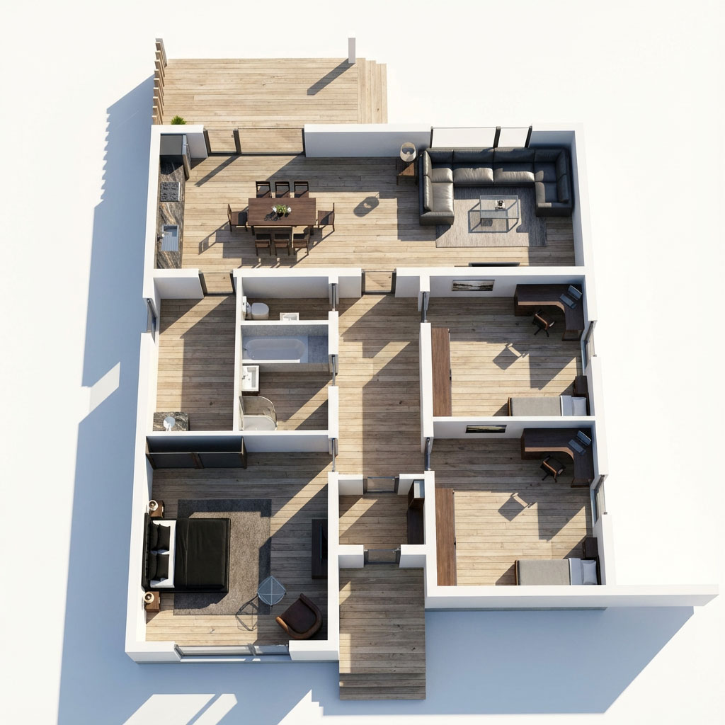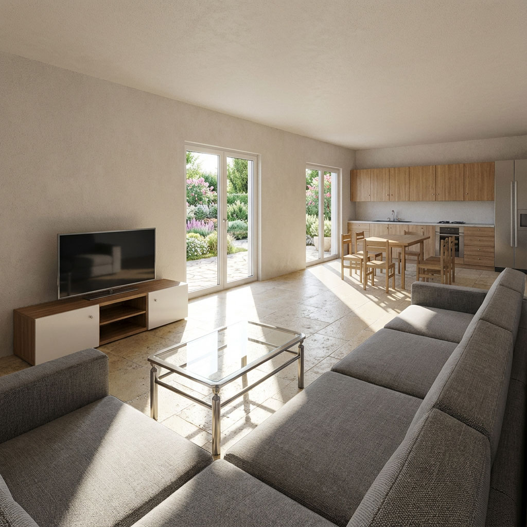 Exteriér domčeka definuje minimalistická fasáda v jemnom sivom odtieni doplnená o vertikálny drevený obklad, ktorý vizuálne ladí s jeho moderným tvarom. Dominantným prvkom je drevená pergola a plochá strecha s výrazným presahom, ktorý elegantne chráni hlavný vstup. Vnútorné usporiadanie ponúka logické rozdelenie na dennú a nočnú časť. Srdcom dispozície je otvorený priestor spájajúci obývaciu izbu s kuchynským kútom. Súkromnú zónu tvoria tri samostatné spálne, pričom hlavná spálňa disponuje vlastným zázemím. Nechýba centrálna kúpeľňa a praktické technické miestnosti prístupné priamo z centrálnej chodby.