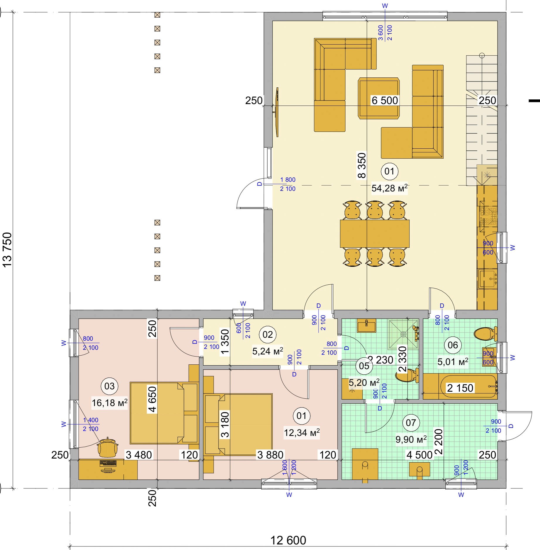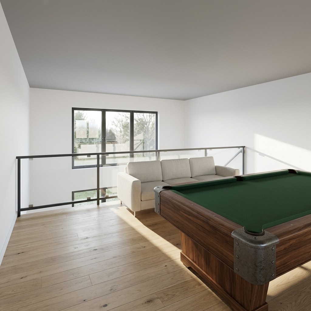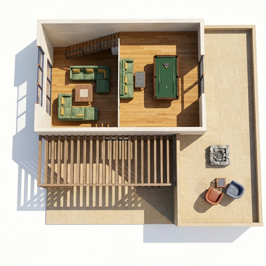 Elegantná a priestranná stavba je tvorená dvoma podlažiami. Na prízemí ju dopĺňa terasa s možnosťou drevenej konštrukcie, ktorá môže zároveň slúžiť ako tienenie. Táto časť vyniká veľkými oknami, vďaka ktorým je interiér priamo prepojený s exteriérom. Na streche nižšej časti je vytvorená pobytová terasa prístupná z druhého poschodia. Dispozične je prízemie navrhnuté ako otvorený denný priestor s priamym napojením na terasu, doplnený o samostatné izby a dve kúpeľne. Schodisko je umiestnené pri obvodovej stene a vedie na poschodie, ktoré je riešené ako otvorený viacúčelový priestor s prístupom na strešnú terasu.