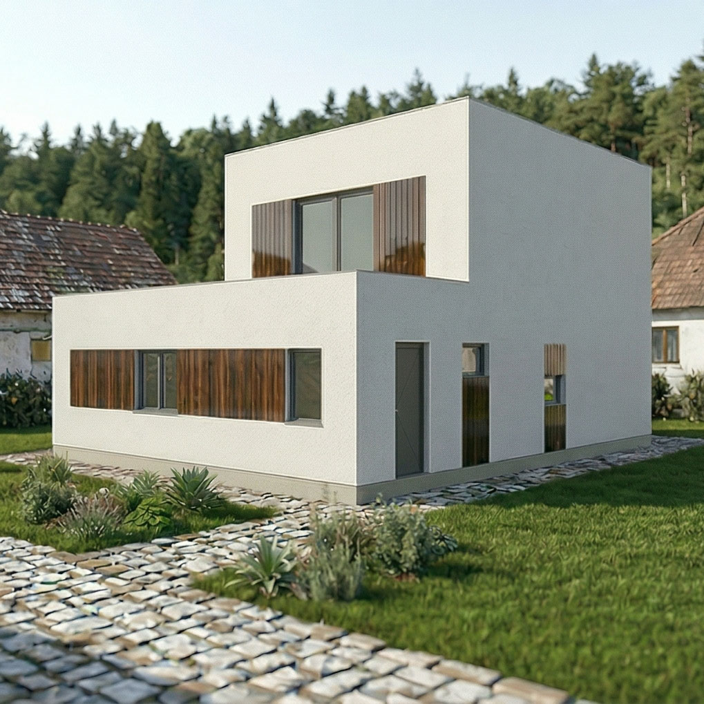 Dom je riešený ako dvojpodlažná stavba s plochou strechou. Nižšia časť je doplnená o krytú terasu s drevenou konštrukciou a veľkoformátovými oknami, zatiaľ čo vyššia dvojpodlažná časť má jednoduchú fasádu a výrazné okenné otvory. Dispozícia prízemia je otvorená a plynulo prepojená, doplnená o samostatné izby a dve kúpeľne. Poschodie tvorí otvorený priestor s výstupom na druhú terasu.